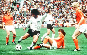 Gerd Mueller remata y anota ante la impotencia de los holandeses, que llegaban a la final con sólo un gol en contra. Eran la "naranja mecánica", aunque no pudieron contra los locales.