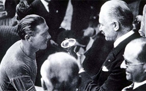 Jules Rimet de manos del Presidente de Francia Albert Lebrun (Fifa.com).