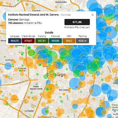 Este mapa contiene todos los colegios diurnos que participaron de la PSU 2014, ya sean pagados, municipales o subvencionados. El tamaño de cada círculo refleja el rendimiento de esa institución. Haz click sobre cada uno para ver detalles y resultados específicos de los casi 3.000 colegios geolocalizados.