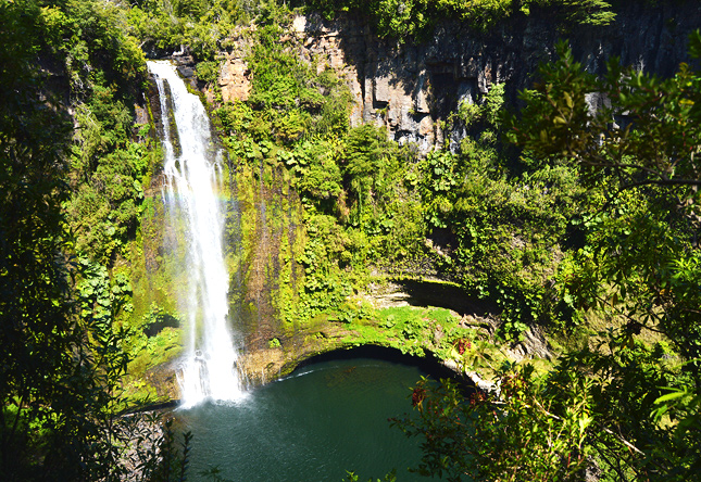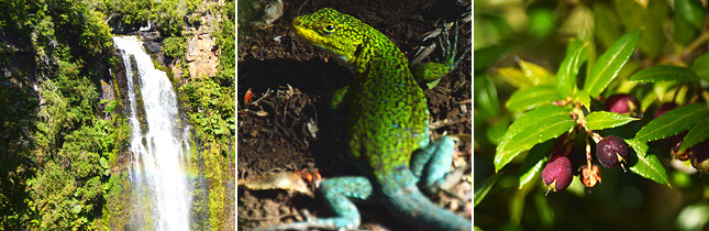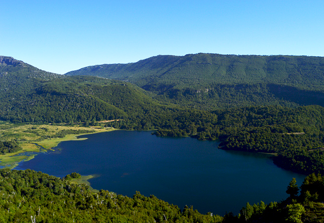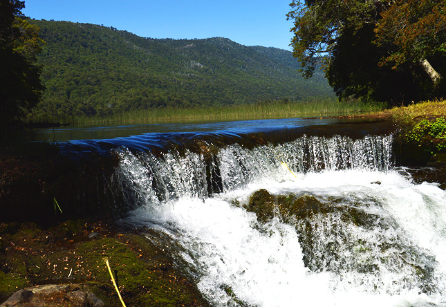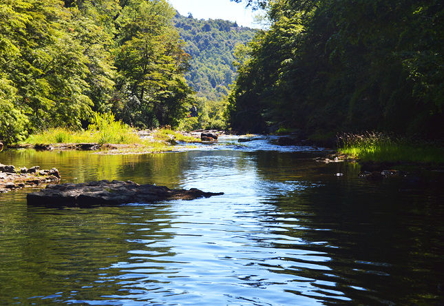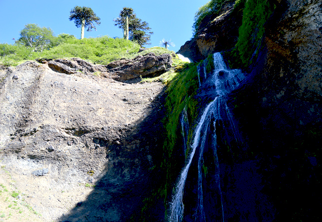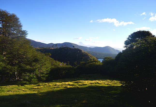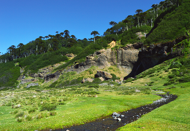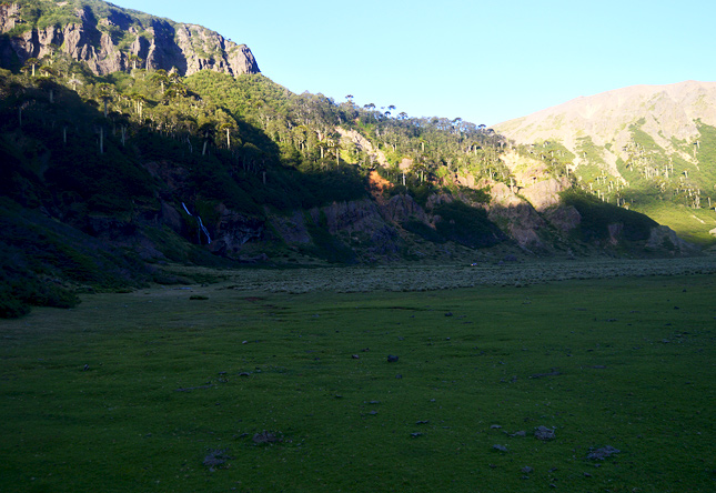 El protagonista de esta historia es un pequeño valle formado por dos volcanes. Cinco minutos en auto o una media hora a pie basta para recorrerlo completo. Mirar las piedras volcánicas que cubren la mitad del lugar y que dan la sensación de estar sobre territorio lunar. Contemplar el salto de agua que se desliza por 15 metros hasta caer sobre rocas y seguir su camino por un pequeño estero de agua que le pide permiso al pasto para zigzaguear elegantemente hasta terminar en una pequeña laguna. Observar los bosques de araucarias que nacen apenas la tierra empieza a elevarse en montes que encajonan aún más la planicie. Levantar la cabeza y quedarse pegado viendo el planeo de los cóndores que buscan algún cadáver perdido. Pararse en la mitad del terreno, girar lentamente en 360 grados y darse cuenta de que estás solo, con una seguridad absoluta de que lo seguirás estando. Aquí, el tiempo no entra en juego; la noche –con sus misteriosos sonidos y el mantel de estrellas- es solamente otra forma que tiene este valle para vanagloriarse de su autenticidad.