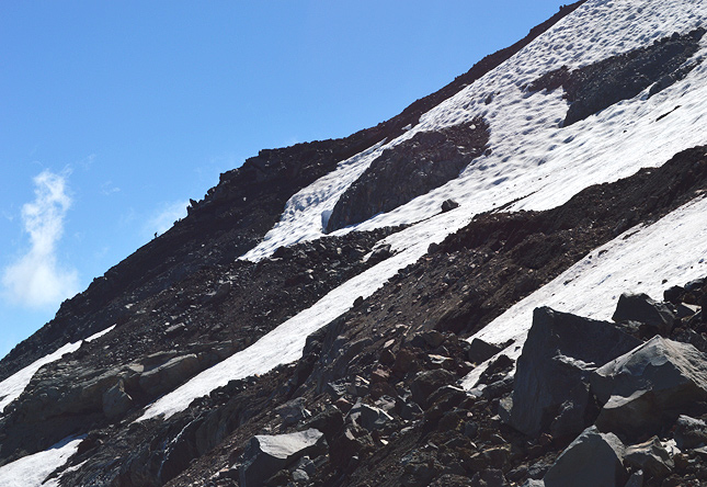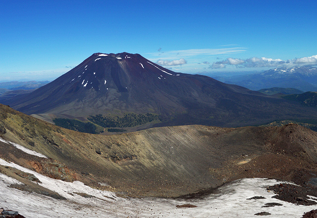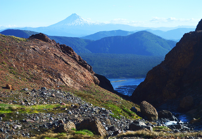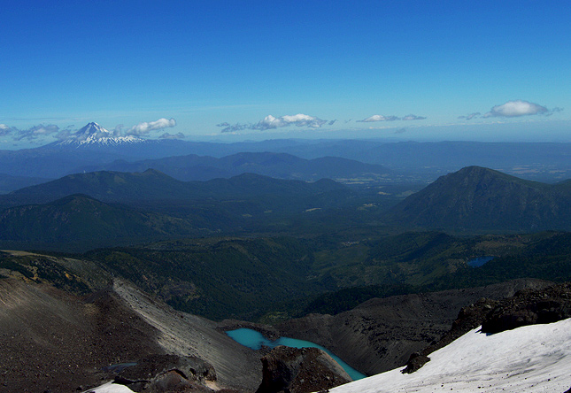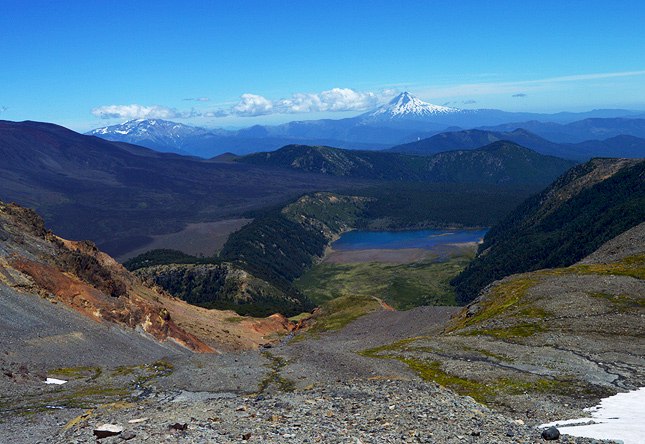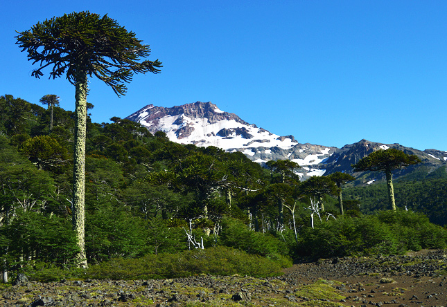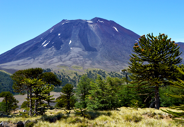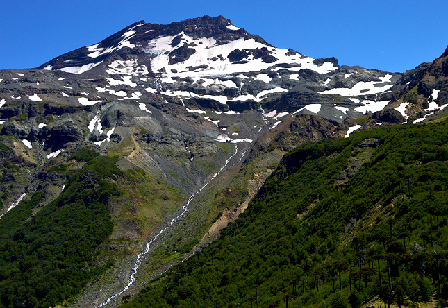 Para encarar los 2.806 metros de este volcán no basta con las ganas y un buen estado físico. Los crampones y un piolet se hacen necesarios para cruzar los planchones de nieve que todo el año cubren la cara sur de la montaña. Antes de comenzar la ascensión idealmente se requiere un machete para podar y hacerse camino entre el bosque de ñirre que espesamente aparece como el primer escollo. Después son cerca de cinco horas de subida en las cuales se atraviesa, de este a oeste, la totalidad de la cara sur del monte a los pies de un imponente farellón de rocas que es constantemente adornado por caídas de aguas que nacen tan solo unos metros más arriba, en los neveros y glaciares que luce, orgulloso, el volcán. Luego, y no sin antes superar algunos tramos de gateos por rocas, que si bien no son complicados son lo suficientemente expuestos para que una desconcentración o una mala maniobra puedan dejar la excursión hasta ese punto, se alcanza la arista que dirige hacia la cumbre. Arriba la panorámica deslumbra y las lagunas del parque nacional brillan junto a los bosques de araucarias, coigües y lengas.