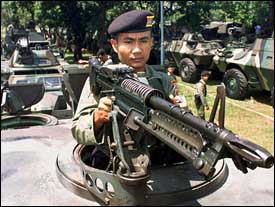 Otros países también están en estado de alerta. Aquí vemos a un soldado filipino armado para defender el Palacio Presidencial y la embajada de Estados Unidos en su país.
