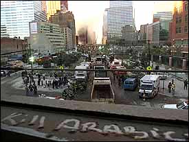 Graffitis anti-árabe con la leyenda "Mátenlos" fueron escritos en el suelo en las cercanías del World Trade Center un día después de que las Torres Gemelas fueran completamente destruidas en un ataque terrorista.
