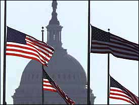 Con el Capitolio por detrás, las banderas norteamericanas flamean a media asta en el Monumento a Washington, en honor a las vidas perdidas en el ataque al Pentágono y al World Trade Center en Nueva York el día martes.