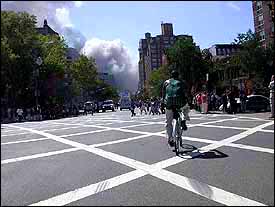 Ya más lejos del lugar, se ve con una mayor perspectiva el desastre ocurrido. A los pocos minutos, la torres colapsarían y quedrían solo como un recuerdo en la mente mundial.
