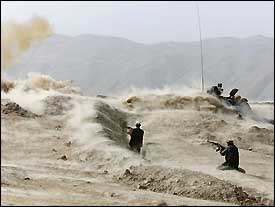 Soldados de la Alianza del Norte disparan desde sus trincheras, en la ciudad de Dashti Kola, en el norte de Afganistán.