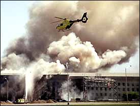 Un helicóptero sobrevuela el Pentágono luego del accidente en que este edificio recibiera el choque frontal del avión.