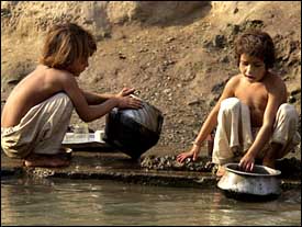 Los niños lavan las ollas en el río, en un campamento cercano a la ciudad paquistaní de Peshawar.