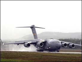 Globemaster III aterriza, tras haber entregado su cargamento humanitario de raciones de comida.