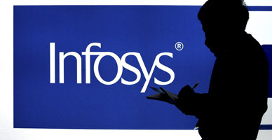 Un hombre delante de un cartel de la empresa informática Infosys en Bangalore (India).