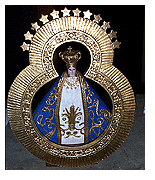 da AparecidaPatrona de Brasil Fiesta: 12 de octubre En 171 tres pescadores - Domingos Garcia, Filipe Pedroso e João Alves - estaban en el río Paraiba pescando para la visita que haría el gobernador a Guaratinguetá. De pronto, al levantar una red, encontraron una figura rota de terracota de la Virgen de la Concepción, de 36 centímetros. Primero hallaron el cuerpo y al arrojar otra vez la red lograron ubicar la cabeza. Luego del suceso, la pesca, que hasta ese momento había sido escasa, fue tan abundante, que tuvieron que volver a la costa por el peso que tenían sus pequeñas embarcaciones. Uno de los pescadores llevó la imagen a su casa y le realizó un pequeño altar, unos años después crearon un oratorio que era visitado por todos los lugareños. El 5 de mayo de 1743, se comenzó a construir un templo, que se inauguró el 26 de julio de 1745, venerando a la Virgen bajo la invocación de Nuestra Señora Aparecida. El pueblo de Nuestra Señora Aparecida se encuentra a unos cuantos kilómetros de Guaratinguetá, villa del Estado de Sao Paulo. Se ignora completamente cómo llegó la imagen al río, pero sí se conoce su autor, un monje de Sao Paulo, llamado Frei Agostino de Jesús quien la moldeo en 1650. La Virgen es de color moreno y esta vestida con un manto grueso bordado, sus manos se ubican en el pecho en posición de oración, fue coronada solemnemente en 1904, por don José de Camargo Barros, obispo de Sao Paulo. Virgen