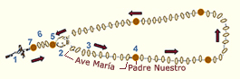 de amor a la Virgen María. El Papa Pío V, que lo prescribió a todo el mundo tal y como se reza hoy día, con sus padrenuestros, Avemarías y glorias. Al inicio se le llamó "Salterio de la Virgen María", porque con su rezo las personas que no sabía leer reemplazaban el rezo del Salterio, es decir, los 150 salmos de la Biblia que los religiosos tenían que leer cada semana. Como se reza 1. La señal de la cruz 2. Rece el primer Padrenuestro y anuncie el Primer Misterio 3. Rece diez Avemarías -una por cada cuenta- y un Gloria 4. Se repite lo mismo, (Padre Nuestro y Avemaría) pero con los misterios que siguen 5. Un Padrenuestro 6. Tres Avemarías por las intenciones del Santo Padre 7. La Salve |