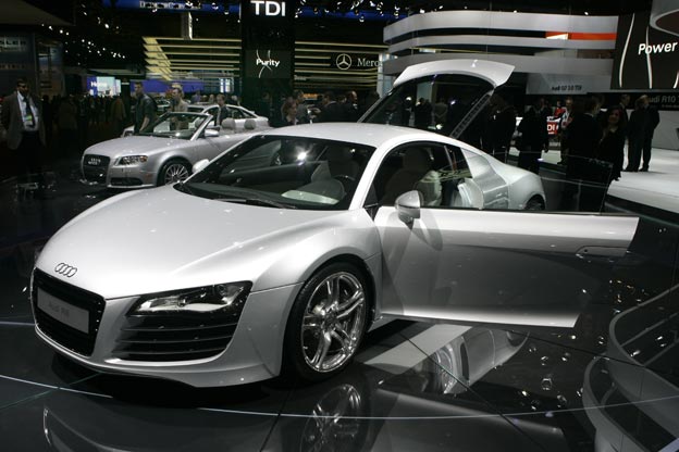 La firma de los cuatro aros exhibe al que fuera cinco veces campeón de Le Mans: el Audi R8. Este modelo que ya se encuentra a la venta llega tres años después de que la marca alemana presentara el prototipo Le Mans Quattro en Frankfurt. El motor es una V8 FSI, que acelera de o a 100 km/h en 4,6 segundos. La potencia máxima es de 420cv a través de una caja de cambios R Tronic.