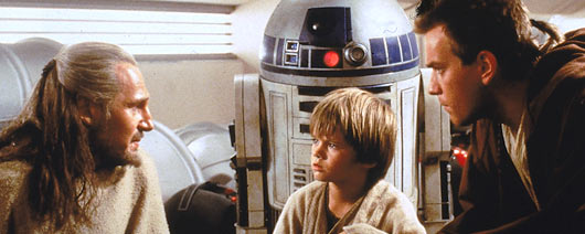 El episodio I traslada la aventura a la infancia de Anakin, cuando aún es un esclavo en el planeta Tatooine junto a su madre y es descubierto por el maestro Jedi Qui-Gon Jinn, quien cree ver en él la encarnación de una antigua profecía que anuncia la llegada de un poderoso guerrero que será capaz de manejar la fuerza mejor que nadie y será el que logre restaurar el balance entre las fuerzas del bien y el mal en la galaxia.