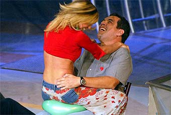 Flaviana, de Axé Bahía, intenta romper un globo sobre Chavito, una de las pruebas que animó esta Teletón.