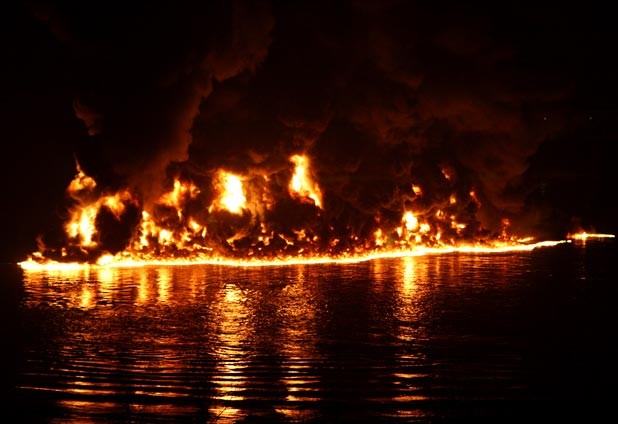 Una hilera de barcazas que contenían petróleo crudo, arden en la superficie del río Mississippi, cerca de Vicksburg. Un portavoz de los guardacostas estadounidenses señalo que no hubo heridos. Ver más.