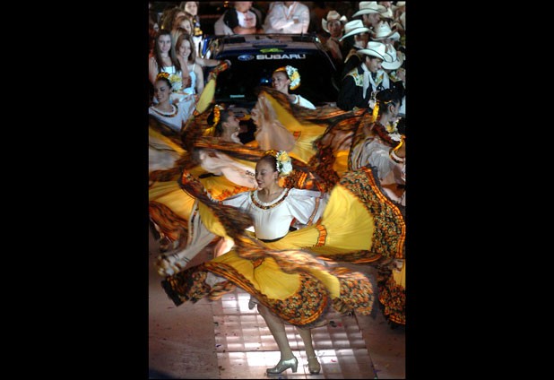 Integrantes del ballet de la Universidad de Guanajuato durante su presentación en la ceremonia de inauguración del "Corona Rally México 2007", cuarta etapa del Campeonato Mundial de Rally, en Guanajuato (México).  Ver más.