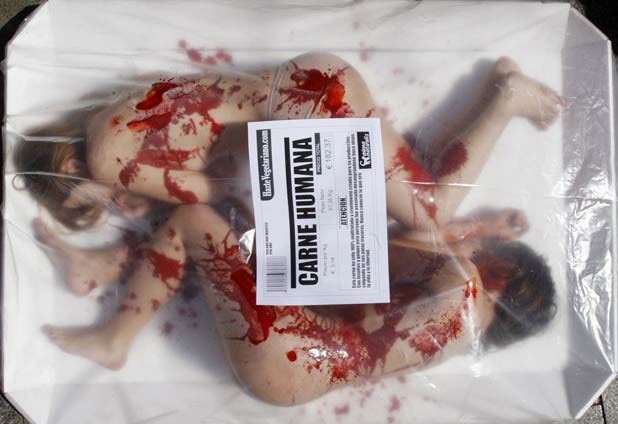 Miembros de Anima Naturalis realiza una protesta en el centro de la ciudad catalana de Barcelona (España) en la cual dos mujeres son empaquetadas con una etiqueta en la que se lee "carne humana", con motivo de promover el vegetarianismo durante el “Día sin carne".  Ver más.