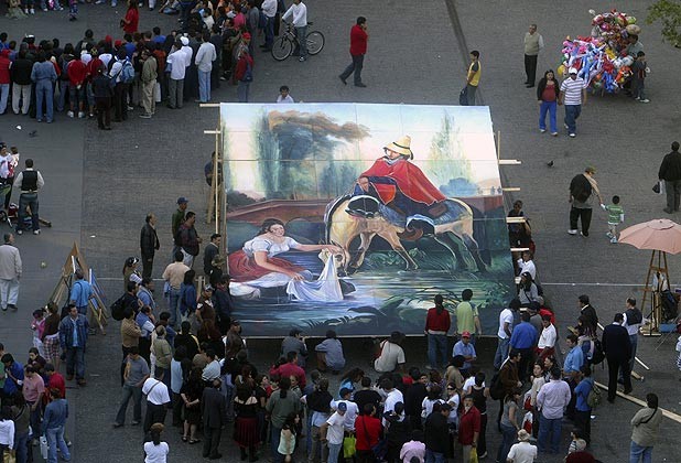 Repleto estaba el Parque Forestal desde las diez y media de la mañana de ayer, cuando el público empezó a reunirse para ver cómo avanzaban los pinceles de los artistas que reconstruían la obra "El huaso y la lavandera", de Mauricio Rugendas, a un tamaño de 6x8 metros, dividido en ochenta y ocho fragmentos. De hecho, se esperaban 20 mil personas, y llegaron más de 30 mil.