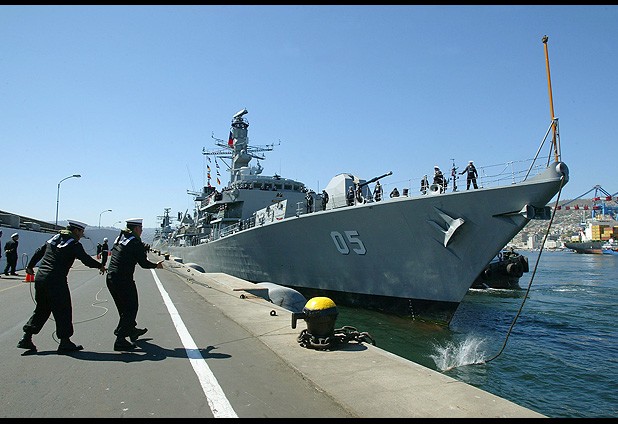 La segunda de las tres fragatas tipo 23, adquiridas por Chile a Inglaterra, como parte del proyecto Puente III, recaló en el Molo de Abrigo de Valparaíso. En la imagen, la fragata " Almirante Cochrane", que zarpó desde el puerto inglés de Portsmouth el 9 de noviembre pasado.  Ver más.