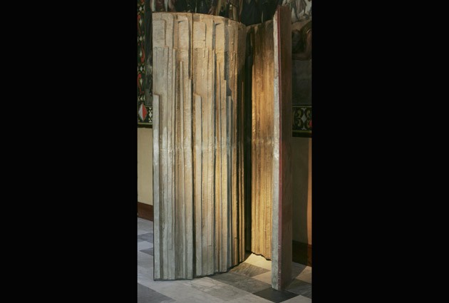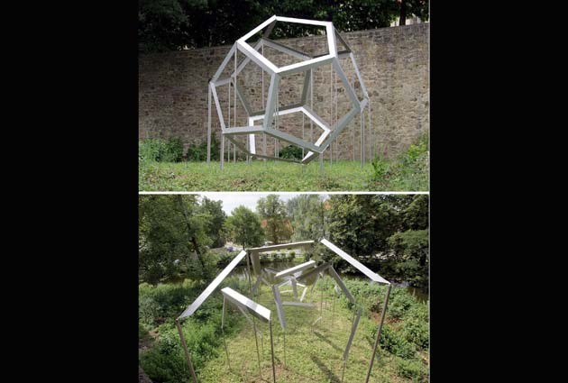 Combo de dos vistas opuestas de la escultura "Le temps deployé" del artista francés Yves Charnay en el Museo Weserrenaissance del Palacio Brake en Lemgo, Alemania. Desde un punto de vista parece 30 barras de acero puestas de cualquier manera. Desde otro punto de vista aparece un dodecaedro de 12 caras. Ver más.