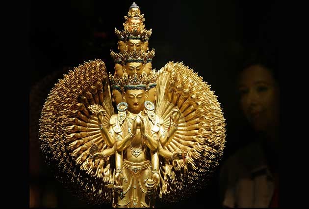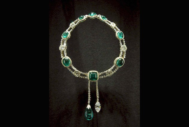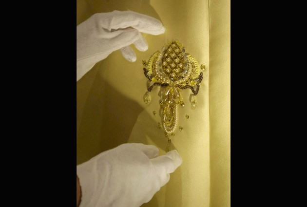 Detalle del collar "Delhi Durbar" que también forma parte de la colección de la Reina de Inglaterra Elizabeth II, y que actualmente se encuentran en exhibición en Londres. La exhibición de vestidos y joyas forma parte de la inaguración veraniega de Buckingham Palace. Ver más.