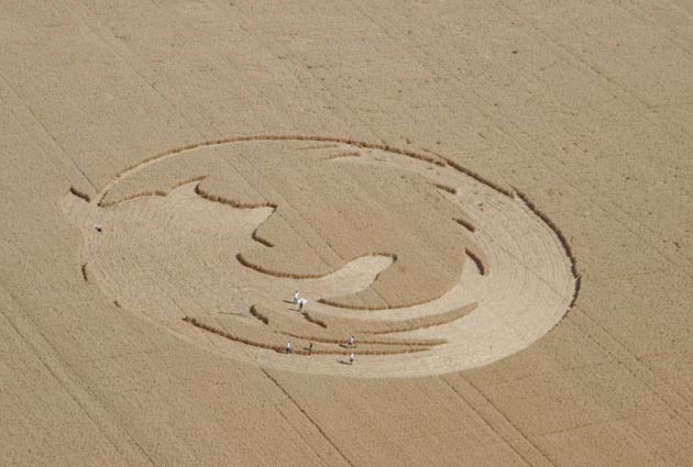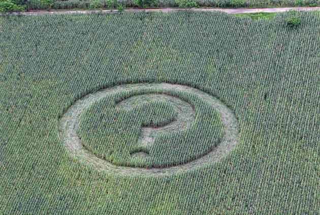 El signo de interrogación fue confeccionado por profesionales de Greenpeace, en Oxaca (Mexico), como una manera de protestar en contra de las manipulaciones genéticas en las plantaciones de maíz. Algunos "crop circles", tambien conocidos como figuras geométricas en campos de cereales son verdaderas obras de arte. Estos círculos suelen realizarse durante la primavera y el verano, justo antes que se cosechen los campos, en varias regiones del mundo. Ver más.