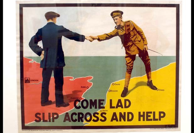 El poster titulado "Come Lad. Slip Across and Help" de un artista desconocido forma parte de la exposición "Armas de Comunicación de Masas", en el Museo Imperial de la Guerra de Londres, Reino Unido. Ver más.