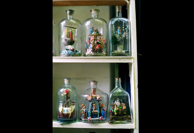 Vista de una colección de "Botellas imposibles" del artista y fotógrafo húngaro Gyoergy Makky expuestas en Budapest, Hungría. Estas botellas, muestra de arte folk, representan escenas de la vida de mineros y marineros, además de asuntos religiosos. Ver más.