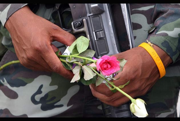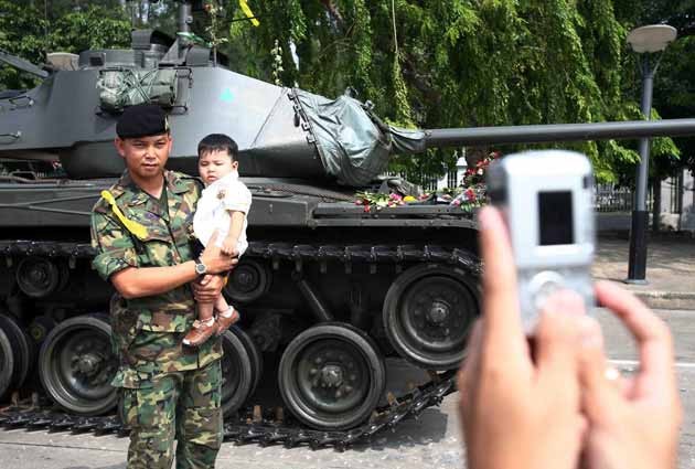 A Thai soldier carries his gun along with flowers given by the supporters of the military coup at Royal Plaza in Bangkok. Thai soldiers presented the smiling face of the military coup, posing for photographs with hands held high in mock surrender in an apparent charm offensuve by their leaders. Thai media reported that troops had been told to "keep smiling", and newspapers were filled with pictures of soldiers demonstrating weaponry to curious crowds. Ver más.