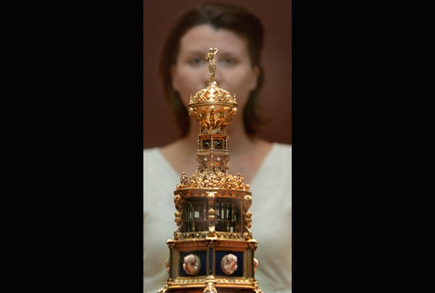 In the image is seen a gold clock owned by sixteenth century British monarch Henry VIII, at the Tate Britain in central London. Made by a French goldsmith, the design was based on the sketches by German artist Hans Holbein the Younger, and it forms part of a major exhibition titled "Holbein In England", with 38 portrait and subject drawings by Holbein, under the patronage of Sir Thomas More and the court of Henry VIII. Ver más.