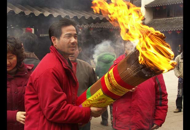 A Chinese worshiper lights a large ammount of incense to pay homage to the Kitchen God at a temple in Zhenjiang, China´s eastern Jiangsu province. The Kitchen God, is China´s most important domestic deity, and reports to the heavens the family´s behavior from the previous year. He is represented with a paper image which hangs throughout the year near the family´s stove where all is seen and heard. Ver más.