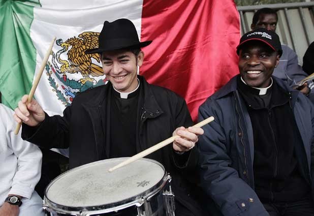 A supporter of the Mater Ecclesiae team plays a drum during the first match of the "Clericus Cup" soccer tournament at Saint Peter´s Oratory in Rome. The tournament will see teams from Rome´s many seminaries battling it out with amateur soccer players from 50 nations taking part in the event. Ver más.