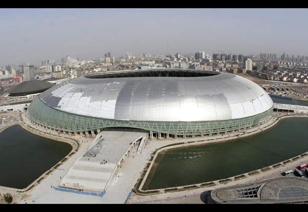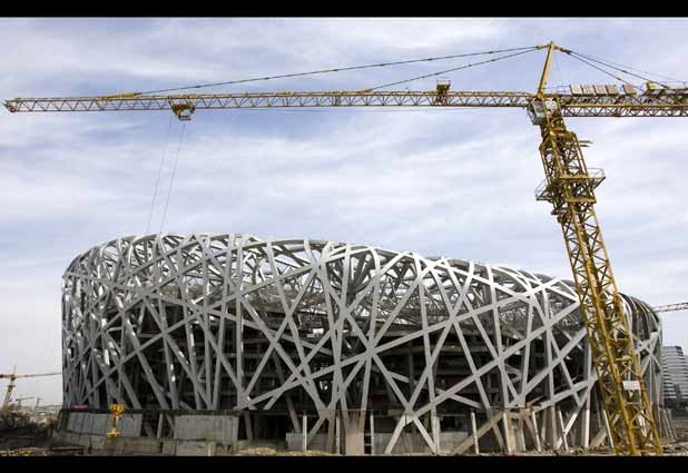 Construction continues on Beijing´s Olympic National Stadium, the venue for the 2008 Olympics opening ceremony and track and field competition. The stadium is known as the "Bird´s Nest", for its elaborate network of steel girders. Ver más.