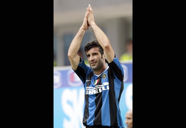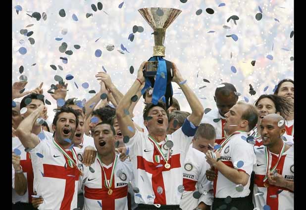 From left, Inter Milan players Luis Figo of Portugal, Ivan Ramiro Cordoba of Colombia, Javier Zanetti of Argentina, Esteban Cambiasso of Argentina, Santiago Solari of Argentina, and Oliver Dacourt of France celebrate holding the trophy after winning the "scudetto" the Italian Serie A top league championship title at the end of an Italian major league soccer match against Torino at the San Siro stadium in Milan. Ver más.