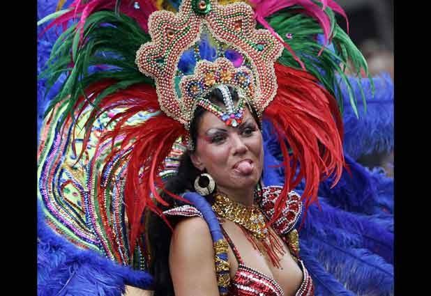 A Samba dancer sticks her tongue during the "Carnival of Cultures" street festival today in Berlin. More than 4,500 participants from all over the world took part in the parade at Berlin´s Kreuzberg district. The idea of thye carnival is to present the cultural and ethnic diversity of the German capital, a city with a large international population. Ver más.