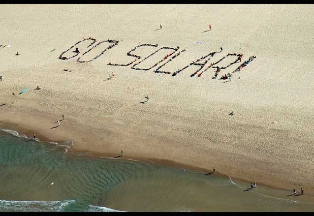 Supporters of the organisation Climate Action Bondi lie on the sand on Sydney´s famous Bondi Beach to spell out the words "Go Solar!" The action was held to promote solar power over nuclear power, today in Australia. Ver más.