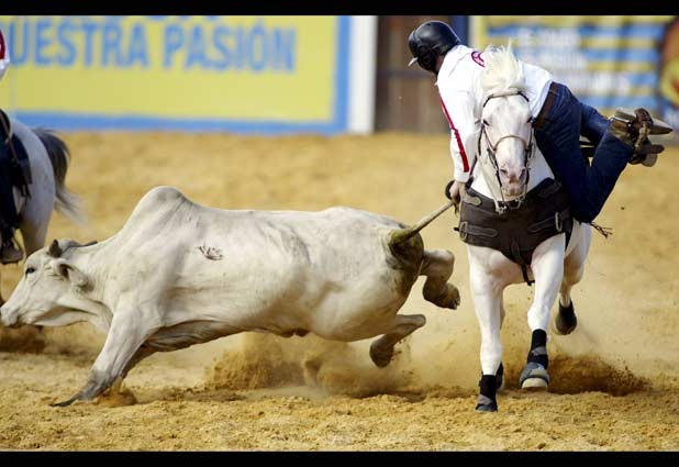 A bull gets tossed around by a cattle worker at a Colombian-style rodeo known as a "Coleo", today in Bogotá. Ver más.