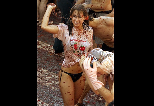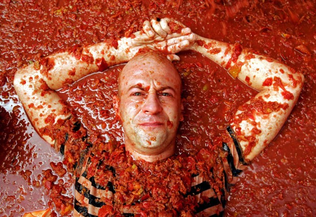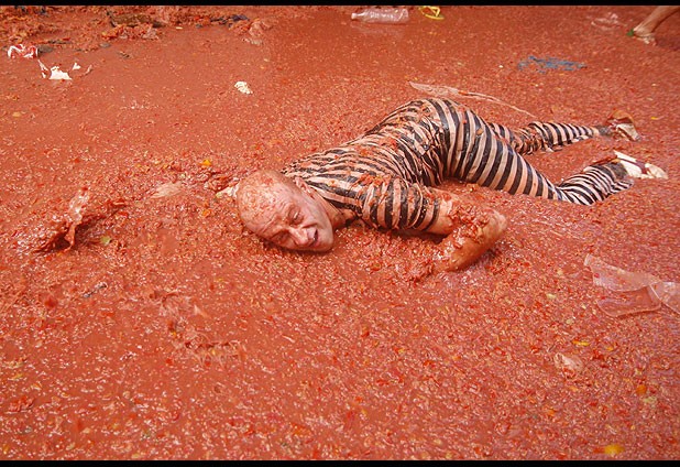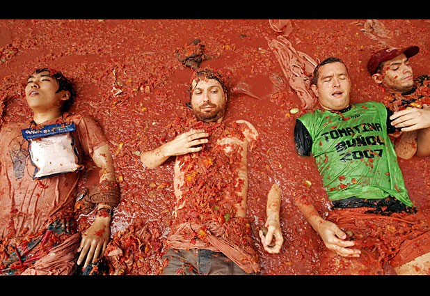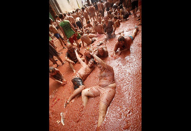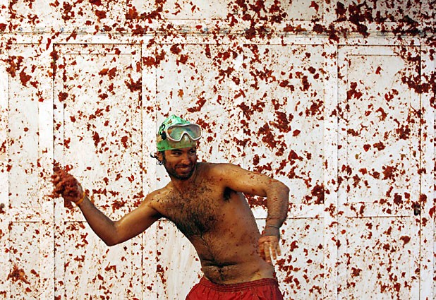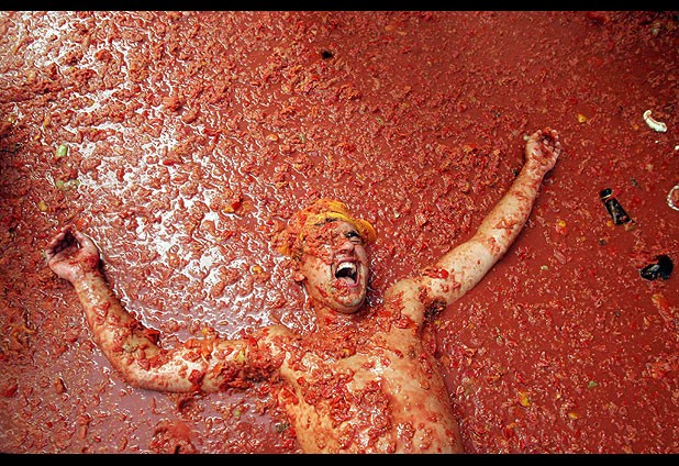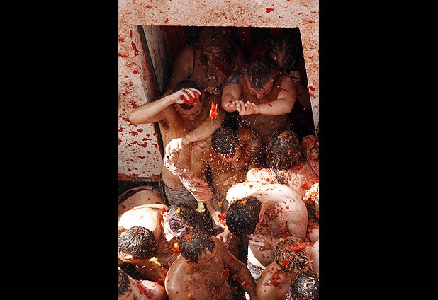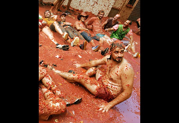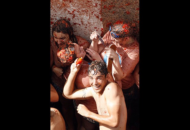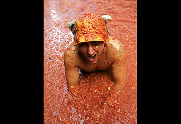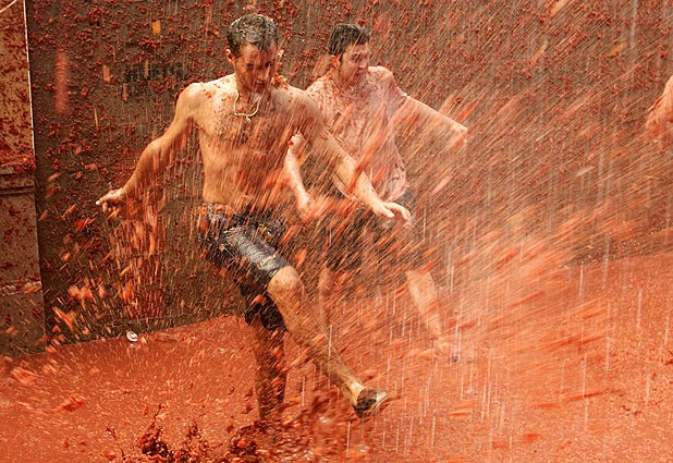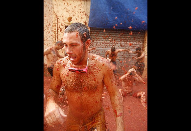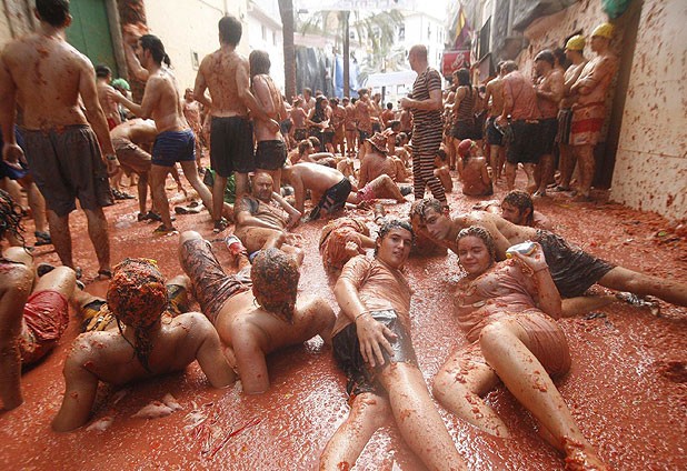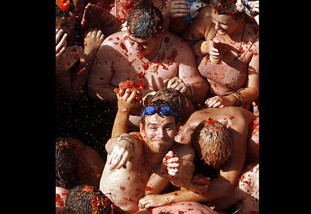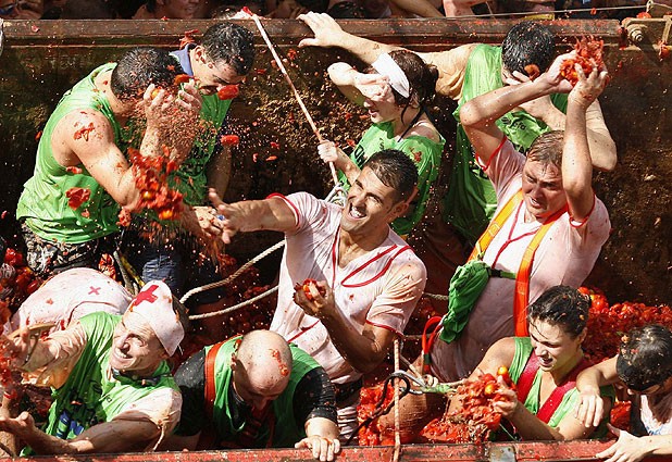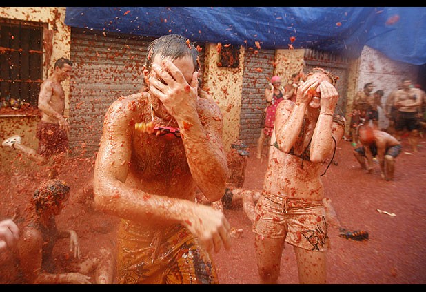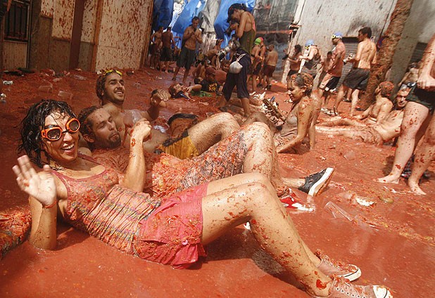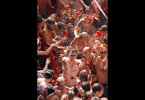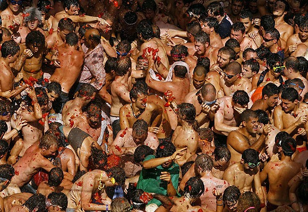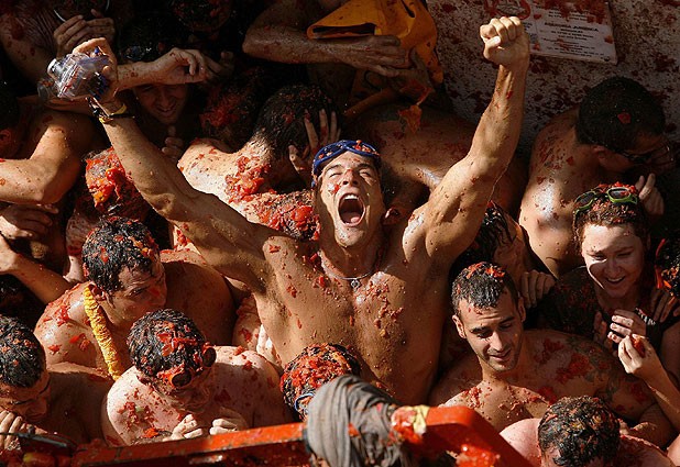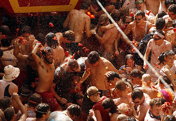 Numerosos participantes, asisten a esta nueva edición de la fiesta de la "tomatina" de Buñol, España, a la que llegaron más de 40.000 personas y en la que se emplearon más de 117.000 kilos de tomates. Publicado por: José I. Nieto.