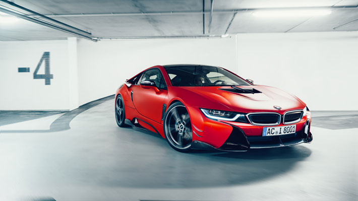 La parrilla del BMW i8 hecho por AC Schnitzer cuenta con una parrilla rediseñada en rojo con detalles cromados. Las llantas de aleación aumentan a 21''.