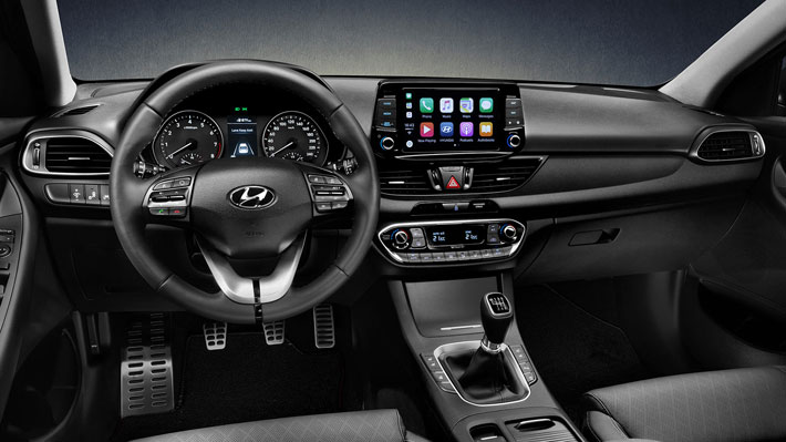 En el habitáculo del Hyundai i30 Fastback destaca la pantalla flotante que está ubicada en el panel central y que de forma opcional, puede ser de 8''. En ella se puede manejar todo el sistema de infoentretenimiento del vehículo, que puede ser compatible con Carplay o Android Auto.