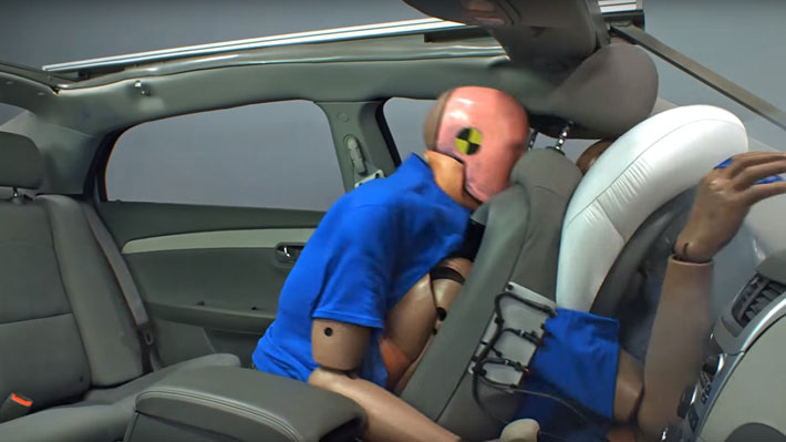 Es por ello que el Insurance Institute for Highway Safety (IIHS) hizo un video con un dummie para reflejar lo que sucede en un choque a 56 km/h. A continuación pueden revisar en las imágenes lo que sucede si no se utiliza protección en la zona trasera del vehículo: