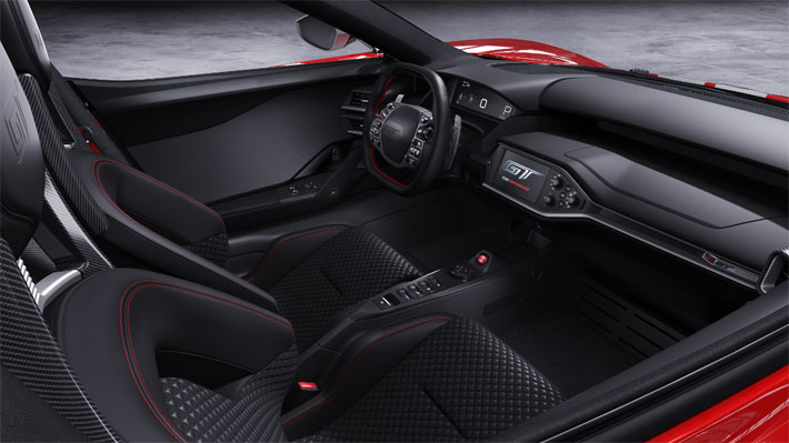 En el interior del Ford GT’67 Heritage Edition destacan los asientos de fibra de carbono con costuras y cinturones de seguridad en rojo, paddle shift y una placa conmemorativa de esta versión.