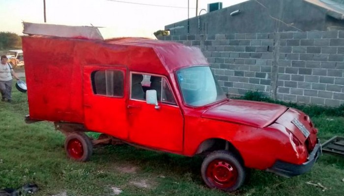 Entonces, Rodríguez tomó un viejo Fiat 1500, le instaló un tren de mando de un más moderno (pero no mucho) Fiat 125 y modificó la carrocería con planchas de metal, las que amartilló hasta darle cierta forma parecida a un furgón.
