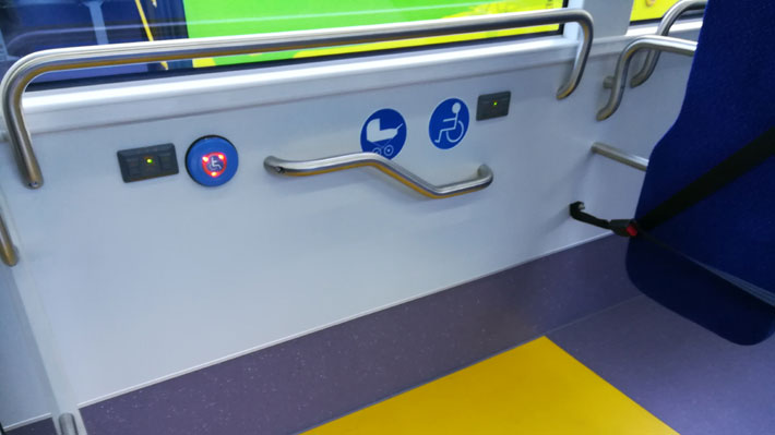 La capacidad es de 30 pasajeros sentados y 50 de pie. Quienes vayan sentados tendrán a su disposición puertos USB para recargar sus dispositivos electrónicos. Hay dos puertos por cada par de asientos. El sector para silla de ruedas también cuenta con este tipo de cargadores, además de un botón especial para solicitar la parada.