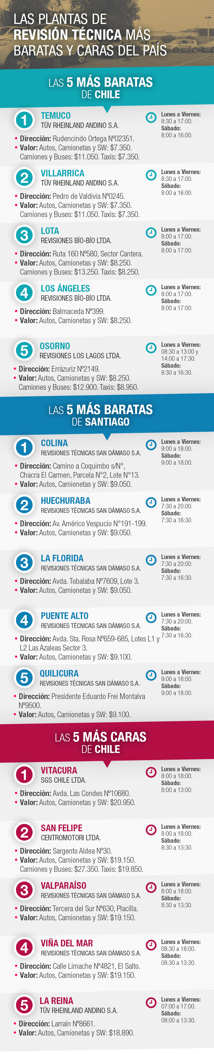 Más de 100 de estos establecimientos se distribuyen a lo largo del país. Las plantas más baratas se ubican en Temuco y Villarrica, donde la revisión técnica a autos y camionetas tiene un valor de $ 7.350. Y la más cara, está en Vitacura, donde el valor asciende a $20.950.