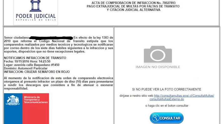 Es por ello que el Ministerio de Transportes y Telecomunicaciones se ha encargado de aclarar que las infracciones hechas por inspectores son notificadas personalmente o mediante el Juzgado de Policía Local que le corresponda y, por ningún motivo, son enviadas por correo electrónico.