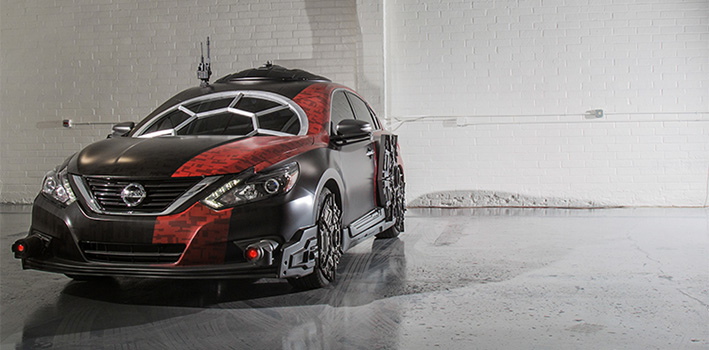 El reconocido Nissan Altima se transformó en una verdadera nave TIE Fighter, recordado vehículo del Imperio. Aunque la estructura en el parabrisas no ayuda mucho a la visibilidad, los colores, llantas y rayos láser lo hacen lucir como un verdadero guerrero.