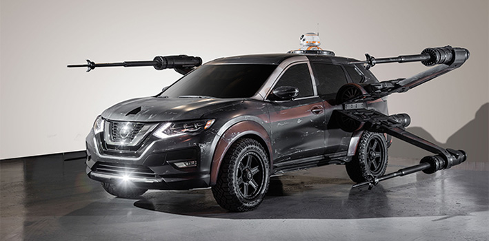 Replicando el clásico look de las naves X Wing, este Nissan Rogue presenta enormes cañones que se extienden por los costados, a lo que se suma un androide BB8 que emerge desde el techo.