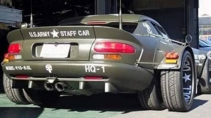 color verde militar de Estados Unidos, un divisor delantero extendido, un capó hecho a medida y una parte trasera con escapes modificados.
